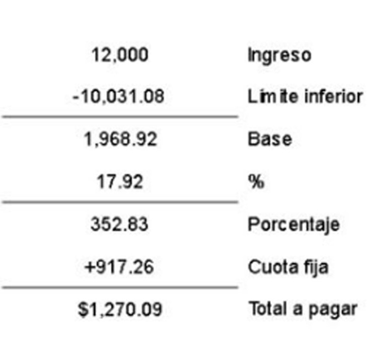 Por ejemplo, si tu ingreso por alquiler es de 12 mil pesos mensuales te ubicas en el rango sombreado en la tabla, ahora tendrás que restar el límite inferior correspondiente a tu ingreso para obtener tu “base”, posteriormente sacar el porcentaje correspondiente (17.92%) y por último sumarle la cuota fija. Quedaría de esta manera: